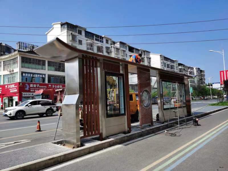 遂寧新型不銹鋼公交站臺設計方案,以不銹鋼和木紋材質(zhì)為肌理,結(jié)合現(xiàn)代、古樸的造型特點,融合地域特色,體現(xiàn)布局通透、明朗的驛站風景。不再是過去單一單調(diào)的以廣告燈箱為主的站臺風格。